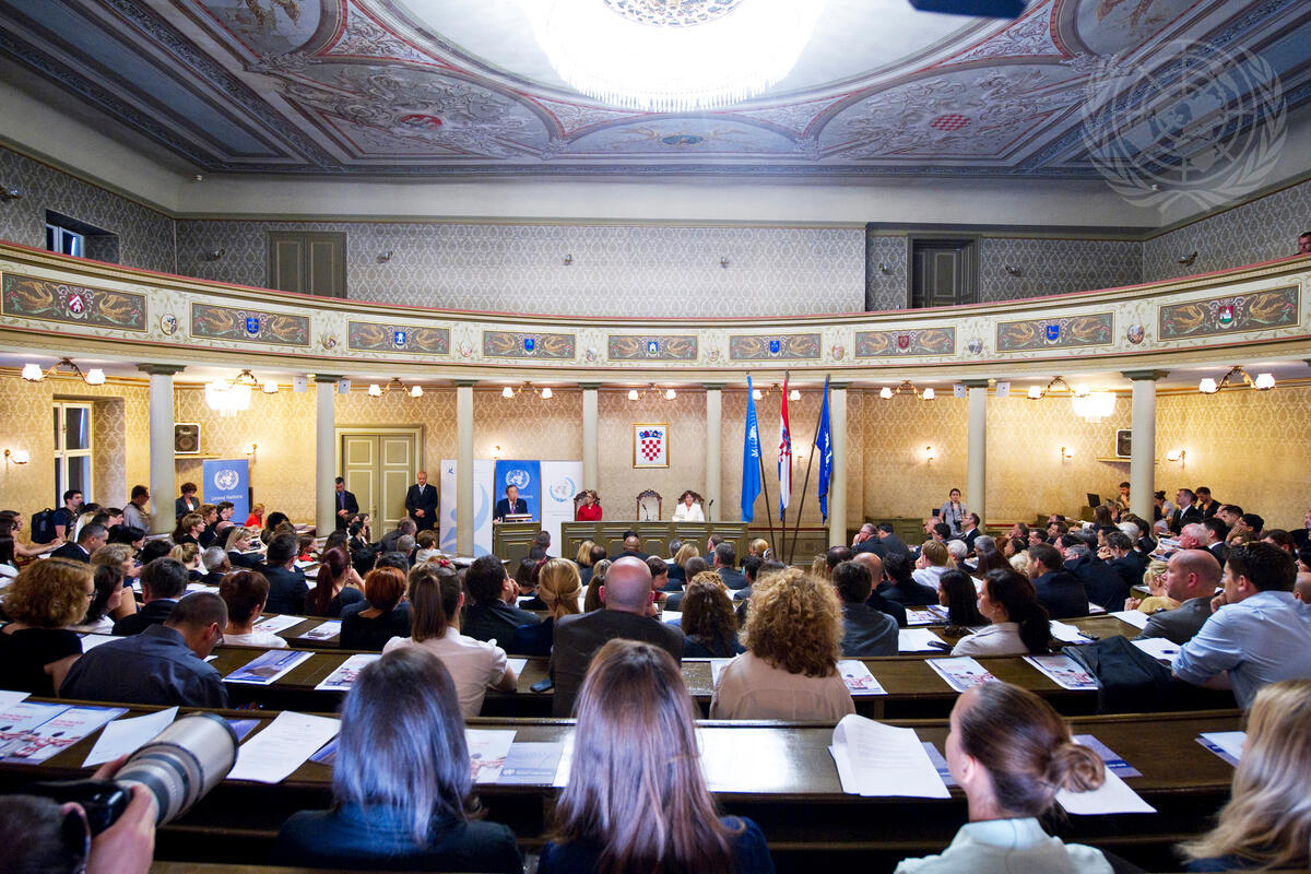 A wide view of the audience at the Zagreb Old City Hall, where Secretary-General Ban Ki-moon is delivering a lecture for the Academy for Political Development on the occasion of the twentieth anniversary of the Republic of Croatia’s membership to the United Nations.