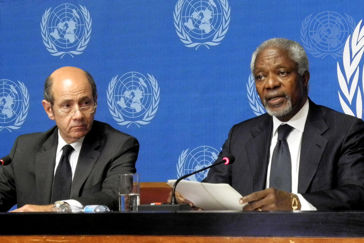 Kofi Annan (right), Joint Special Envoy of the United Nations and the League of Arab States for Syria, speaks at a press conference in Geneva. Mr. Annan announced that he would not continue in his role beyond the end of August. At left is his Spokesperson, Ahmad Fawzi.