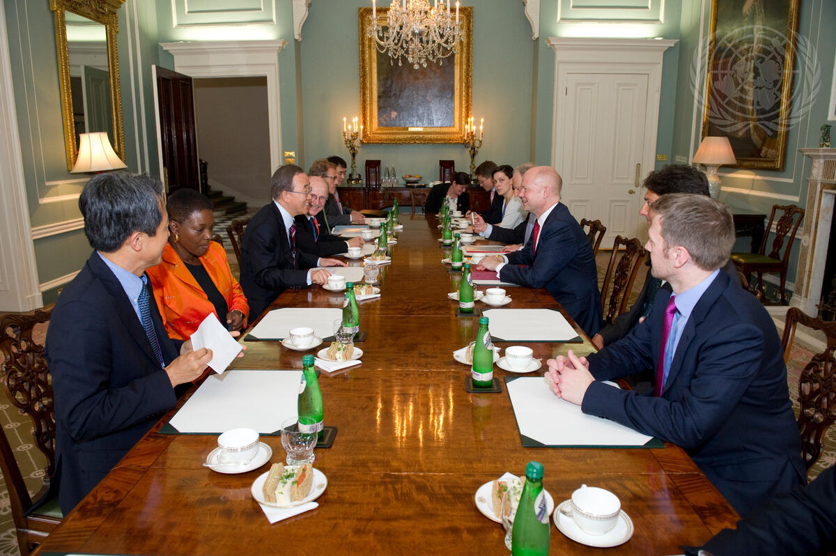 Secretary-General Ban Ki-moon (third from left) meets with William Hague (third from right), Secretary of State for Foreign and Commonwealth Affairs of the United Kingdom.