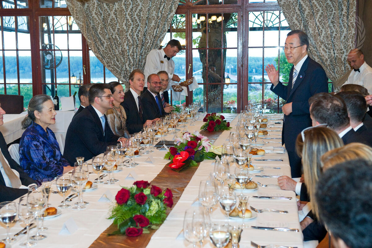 Secretary-General Ban Ki-moon (standing) speaks at a dinner held in his honour by Vuk Jeremic (second from left), Minister for Foreign Affairs of Serbia and President-elect of the UN General Assembly.