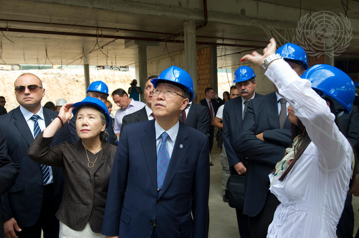Secretary-General Ban Ki-moon (centre, in blue tie) and his wife, Yoo Soon-taek (left of Mr. Ban), tour the construction site of an eco-building which will house UN offices in Podgorica, Montenegro.