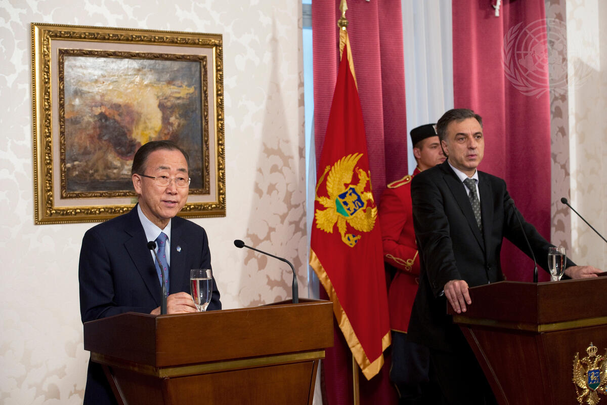 Secretary-General Ban Ki-moon (left) holds a joint press conference with Filip Vujanovic, President of Montenegro.