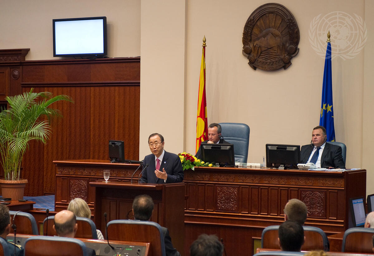 Secretary-General Ban Ki-moon addresses the Parliament of the former Yugoslav Republic of Macedonia.