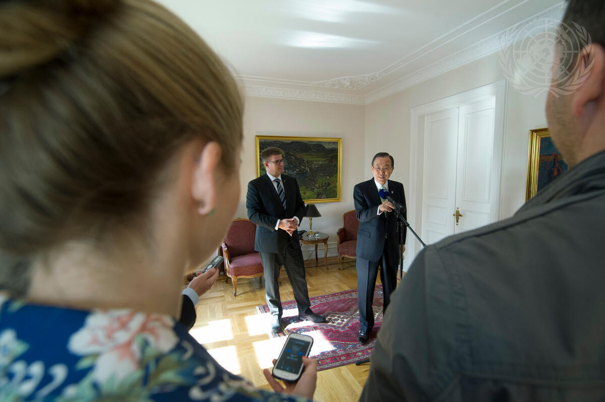 Secretary-General Ban Ki-moon (centre right) met with Gunnar Bragi Sveinsson (centre left), Minister for Foreign Affairs of Iceland, after which they jointly spoke to journalists.