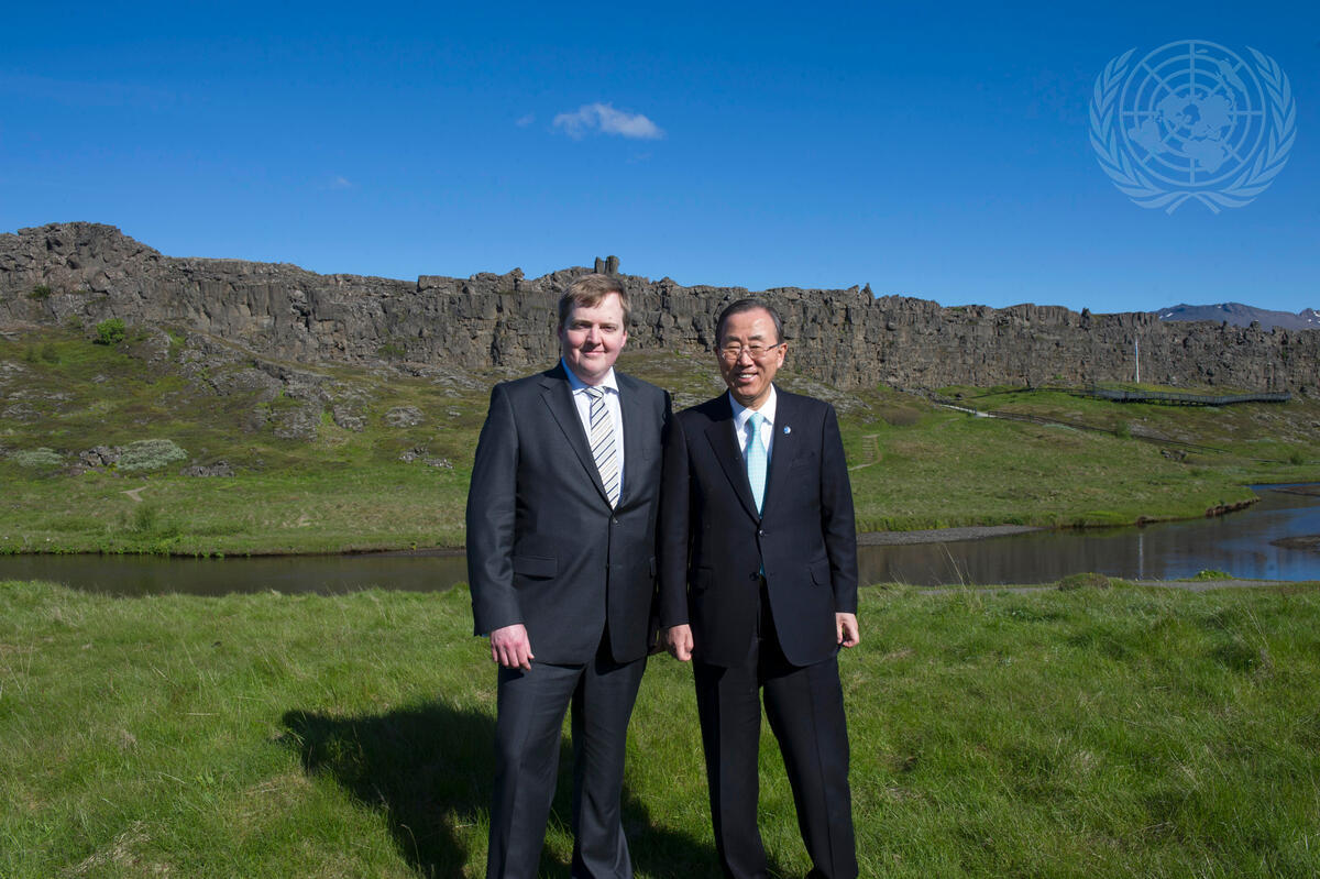 Secretary-General Ban Ki-moon (right) poses with Sigmundur Davíð Gunnlaugsson, Prime Minister of Iceland, during his visit to Thingvellir National Park.