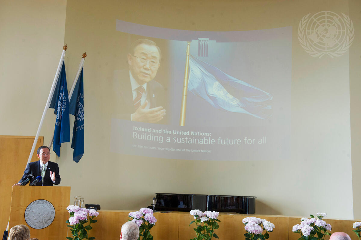 Secretary-General Ban Ki-moon (left) speaks at the University of Iceland. In his remarks, he said that Iceland is a global leader in renewable energy, giving the world a glimpse of the possibility of a sustainable, low-emissions future.