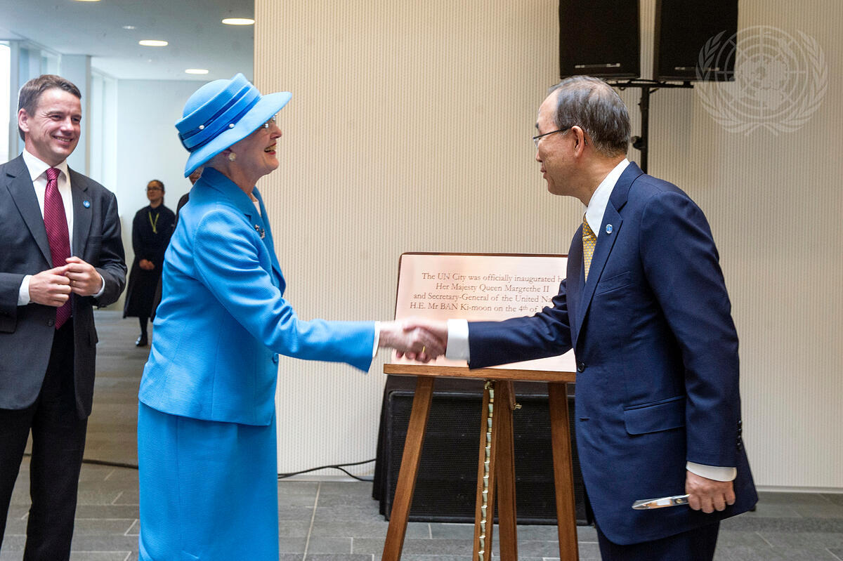 Secretary-General Ban Ki-moon (right) shakes hands with Queen Margrethe II of Denmark during the ribbon-cutting ceremony inaugurating UN City in Copenhagen, an environmentally friendly compound for United Nations agencies based in Copenhagen, Denmark.