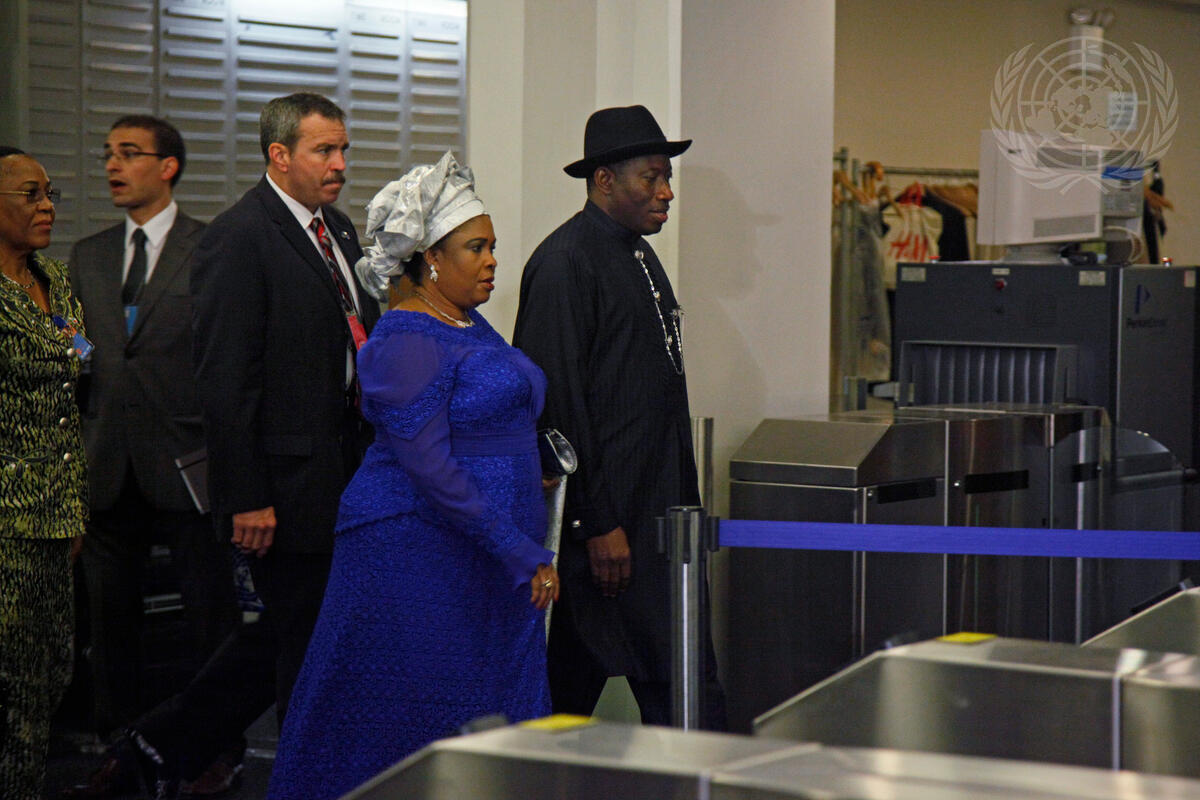 Goodluck Ebele Jonathan (right), President of Nigeria, and his wife, Patience Goodluck Jonathan (centre), arrive for the opening of the general debate of the sixty-sixth session of the General Assembly.