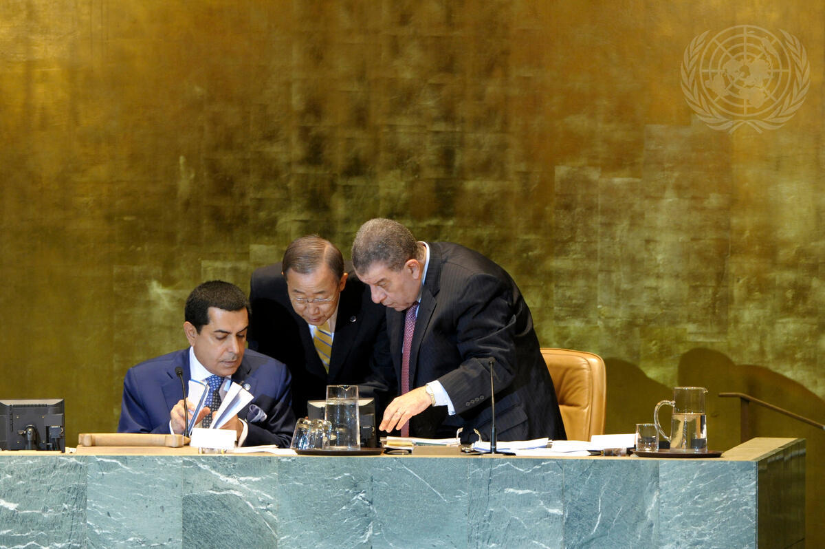 Nassir Abdulaziz Al-Nasser (left), President of the sixty-sixth session of the General Assembly, confers with Secretary-General Ban Ki-moon (centre) and Muhammad Shaaban, Under-Secretary-General for General Assembly Affairs and Conference Management, before the opening of the Assembly's general debate.