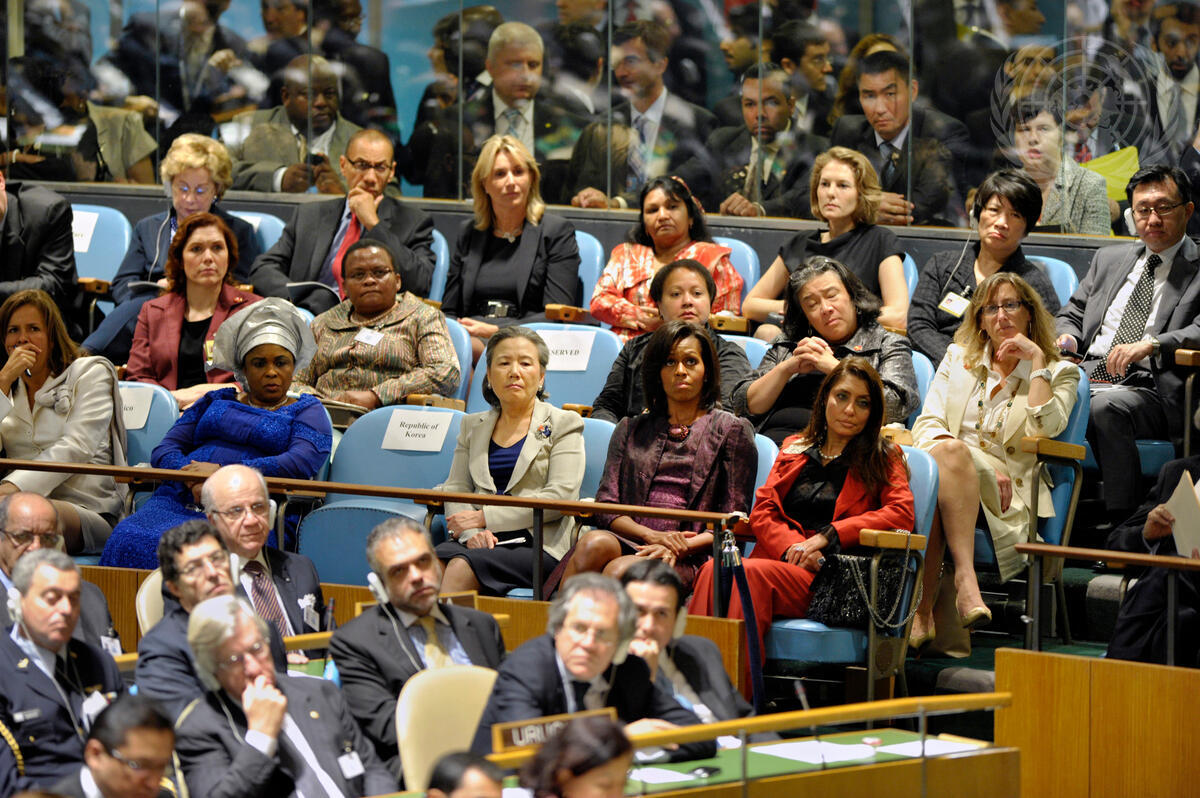 Front row, right to left: Muna Ghassan Tamim Rihani, wife of Nassir Abdulaziz Al-Nasser, President of the sixty-sixth session of the General Assembly; Michelle Obama, First Lady of the United States of America; and Yoo Soon-taek, wife of UN Secretary-General Ban Ki-moon.