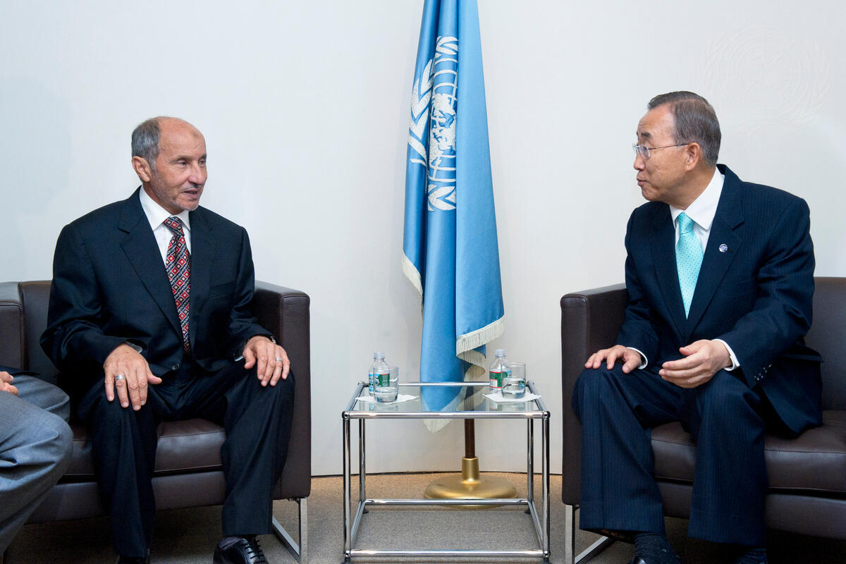 Secretary-General Ban Ki-moon (right) meets with Mustafa Mohammed Abdul Jalil, President of the National Transitional Council (NTC) of Libya.