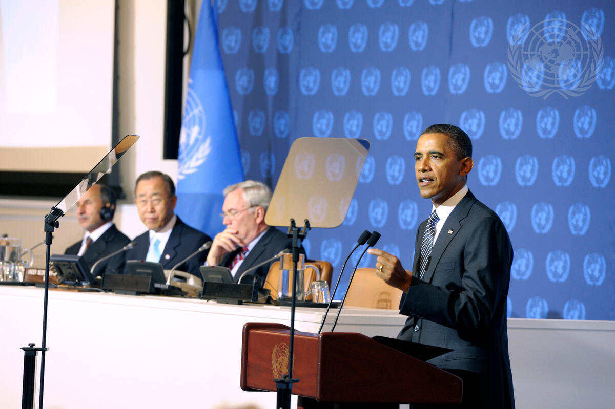 United States President Barack Obama (right) addresses the high-level meeting on Libya convened by the UN Secretary-General, on the sidelines of the General Assembly session.