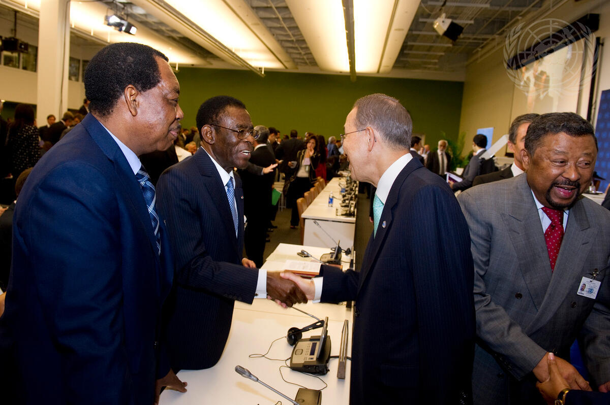 Secretary-General Ban Ki-moon (second from right) greets Teodoro Obiang Nguema Mbasogo, President of Equatorial Guinea, at the High-Level Meeting on Libya. On right is Jean Ping, Chair of the African Union Commission.
