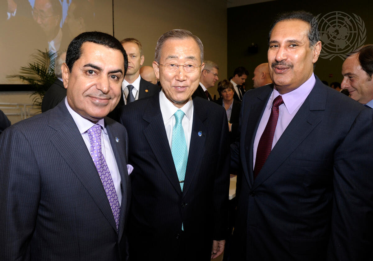 Secretary-General Ban Ki-moon (centre) meets with Sheikh Hamad bin Jassim bin Jabr Al-Thani (right), Prime Minister of the State of Qatar, and Nassir Abdulaziz Al-Nasser, President of the sixty-sixth session of the General Assembly, at the High-Level Meeting on Libya.