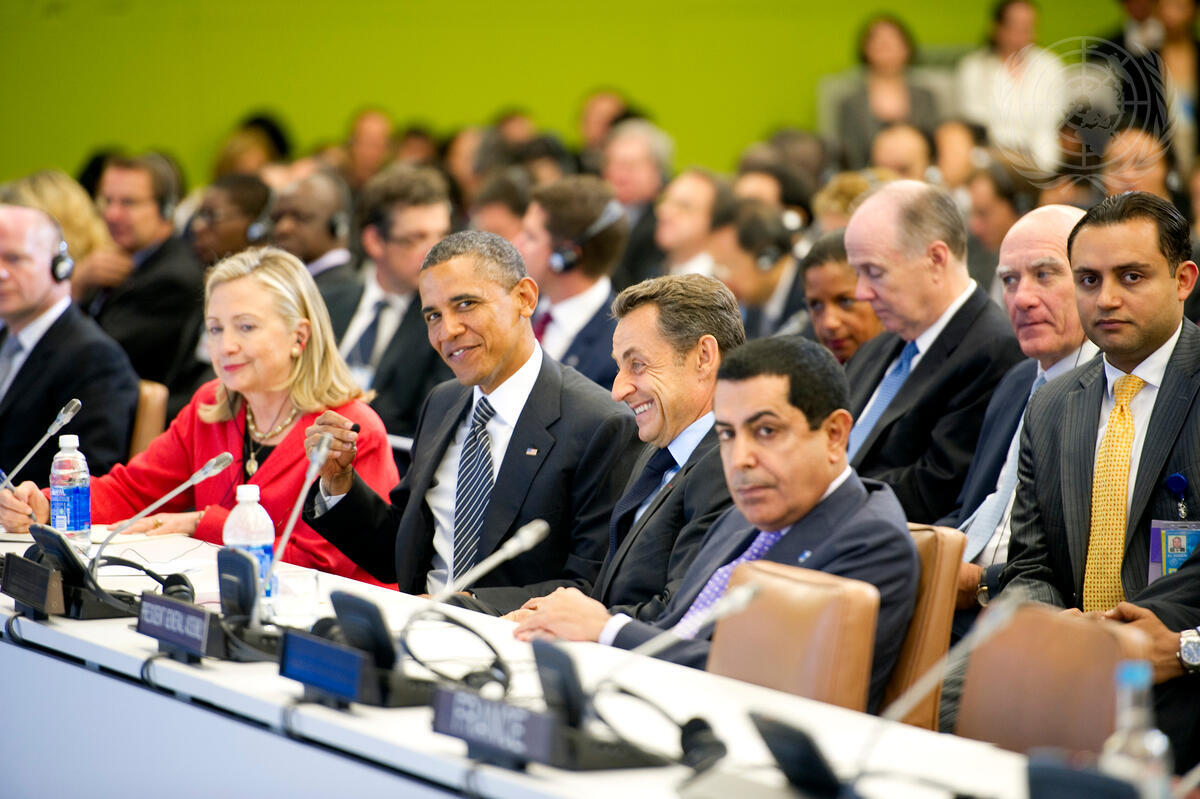 United States President Barack Obama (second from left), flanked by U.S. Secretary of State Hillary Rodham Clinton (left), and President of France Nicolas Sarkozy, smiles at the camera during the high-level meeting on Libya. Also pictured is President of the sixty-sixth session of the General Assembly, Nassir Abdulaziz Al-Nasser (front, right).