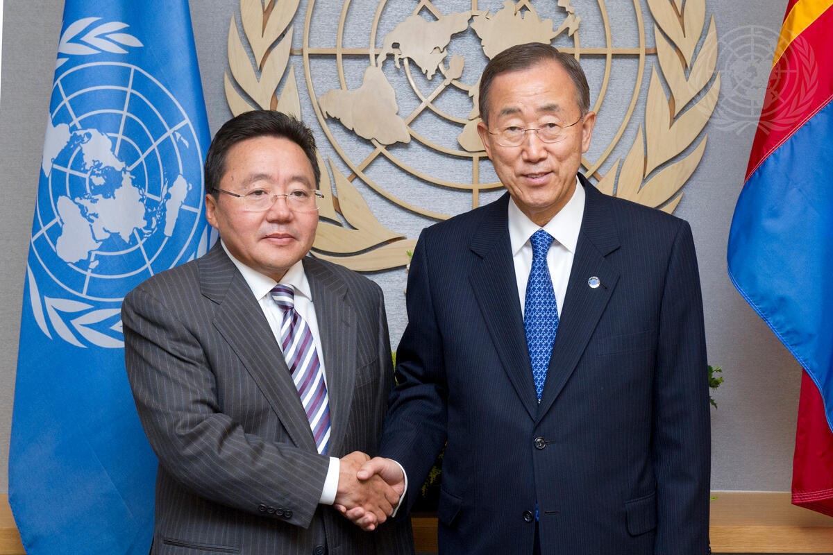 Secretary-General Ban Ki-moon (right) meets with Elbegdorj Tsakhia, President of Mongolia.
