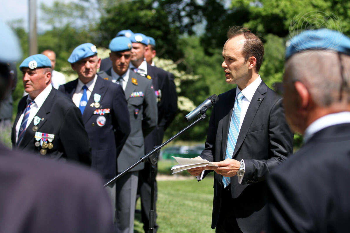 Joshua Lincoln, Chef de Cabinet to the Director-General of the UN Office at Geneva (UNOG), speaks at the ceremony marking this year’s International Day of UN Peacekeepers in Ariana Park, Geneva. The observance pays tribute to the hard work of 120,000 peacekeepers in 17 missions around the world, as well as to the over one hundred blue helmets who were killed in the line of duty last year.