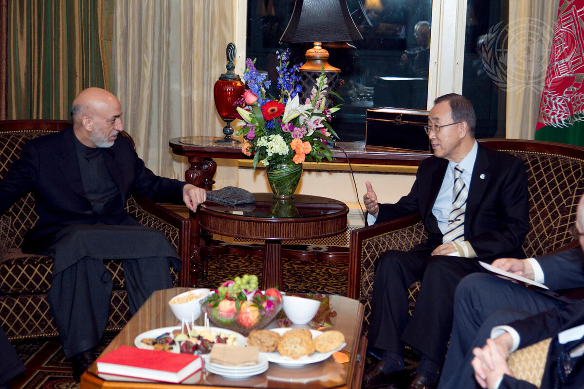 Secretary-General Ban Ki-moon (right) meets with Hamid Karzai, President of Afghanistan, on the sidelines of the 25th North Atlantic Treaty Organization (NATO) Summit in Chicago.