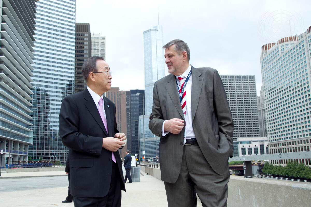 Secretary-General Ban Ki-moon (left) chats with his Special Representative for Afghanistan, Ján Kubiš, outside the 25th North Atlantic Treaty Organization (NATO) Summit, in Chicago.