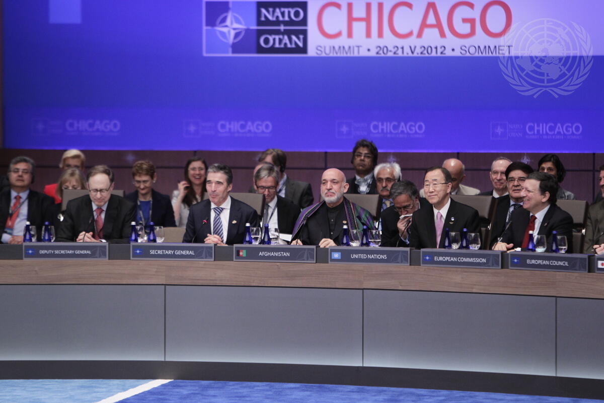 Secretary-General Ban Ki-moon (second from right) attends the meeting on Afghanistan during the 25th North Atlantic Treaty Organization (NATO) Summit, in Chicago.