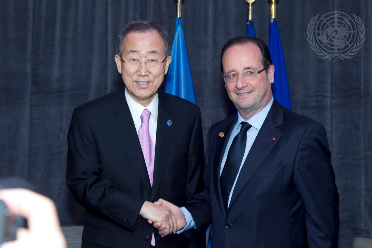 Secretary-General Ban Ki-moon (left) meets newly-elected President of France, François Hollande, on the sidelines of the 25th Summit of the North Atlantic Treaty Organization (NATO), in Chicago.