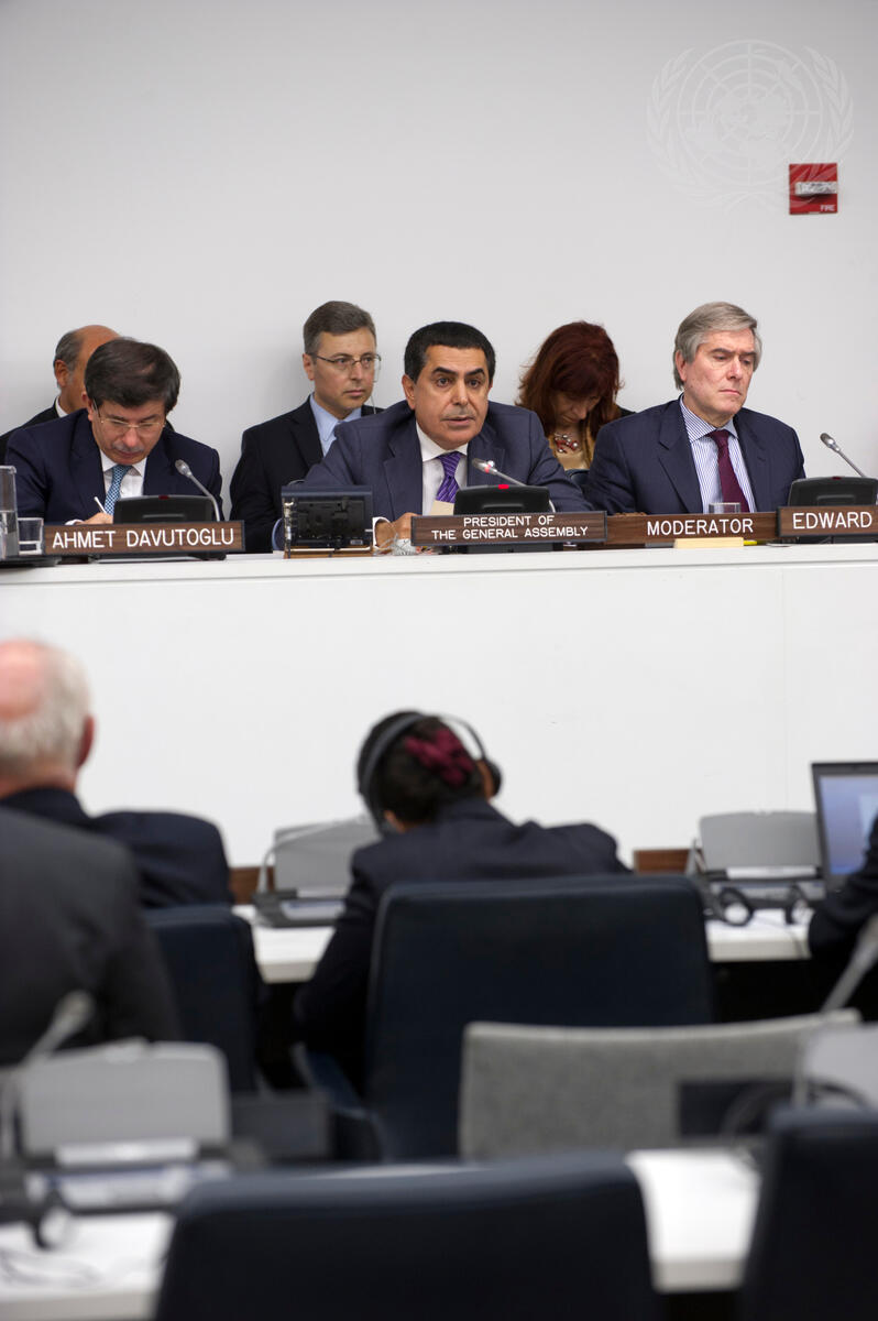 Nassir Abdulaziz Al-Nasser (centre), President of the sixty-sixth session of the General Assembly, speaks at the closing session of the Assembly’s day-long, high-level meeting on ""The Role of Member States in Mediation"", flanked by Ahmet Davutoglu (left), Minister for Foreign Affairs of Turkey, and Edward C. Luck, Special Adviser to the Secretary-General.