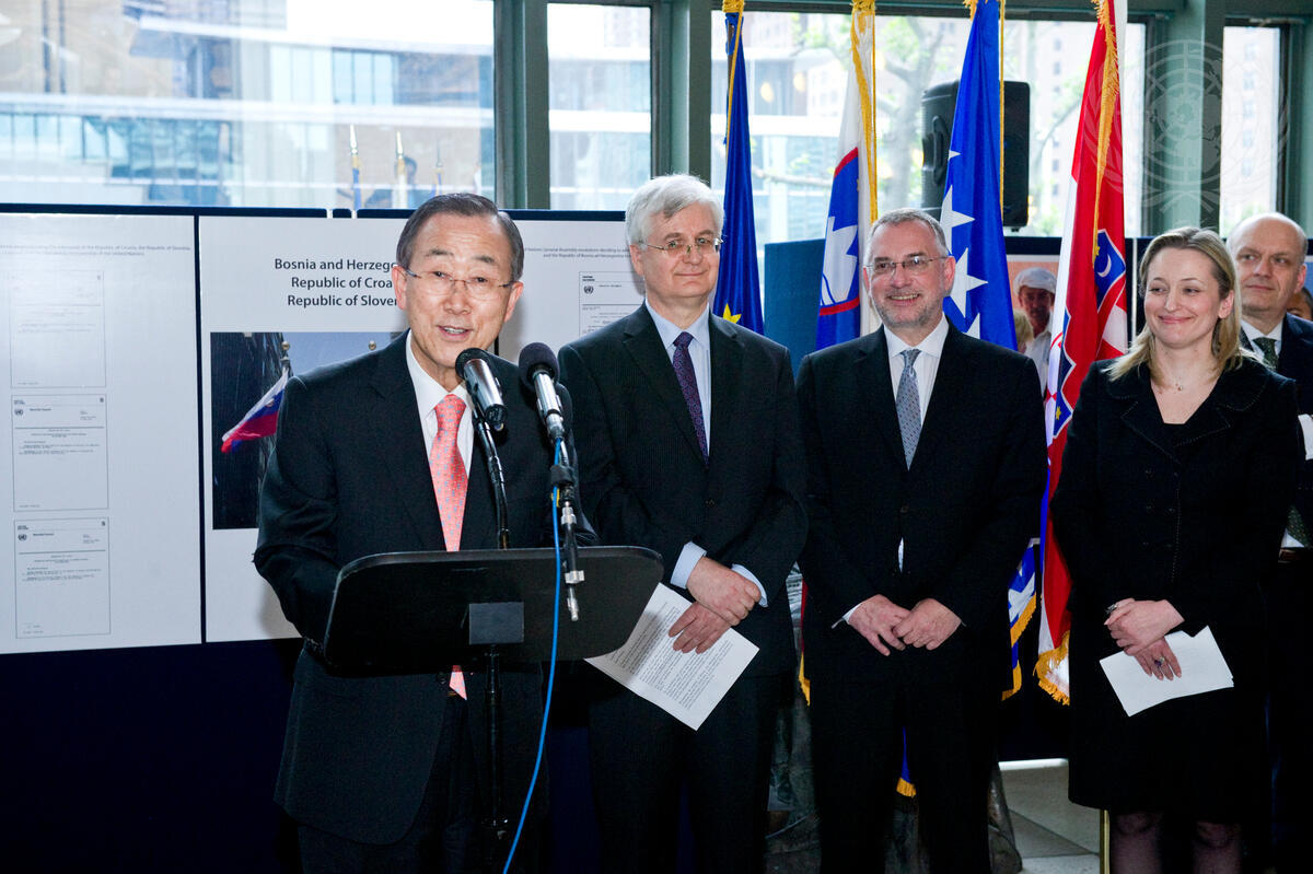 Pictured with Mr. Ban are the Permanent Representatives to the United Nations of those countries (from left): Miloš Vukašinovic (Bosnia and Herzegovina); Ranko Vilovic (Croatia); and Sanja Štiglic (Slovenia).