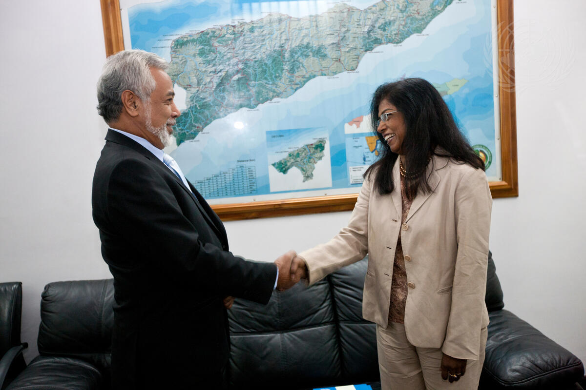 Ameerah Haq (right), Special Representative of the Secretary-General and Head of the UN’s mission in Timor-Leste (UNMIT), meets with Timorese Prime Minsiter Kay Rala Xanana Gusmão, before a symbolic handover of assets from UNMIT to the Government.