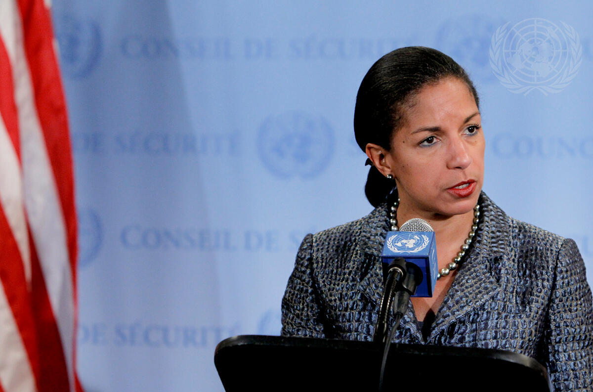 Susan Rice, Permanent Representative of the United States to the UN, speaks to reporters following a closed-door briefing to the Security Council by Under-Secretary-General for Peacekeeping, Hervé Ladsous, and Haile Menkerios, Special Envoy of the Secretary-General for Sudan and South Sudan, on the reported withdrawal of those two countries from the disputed region of Abyei.