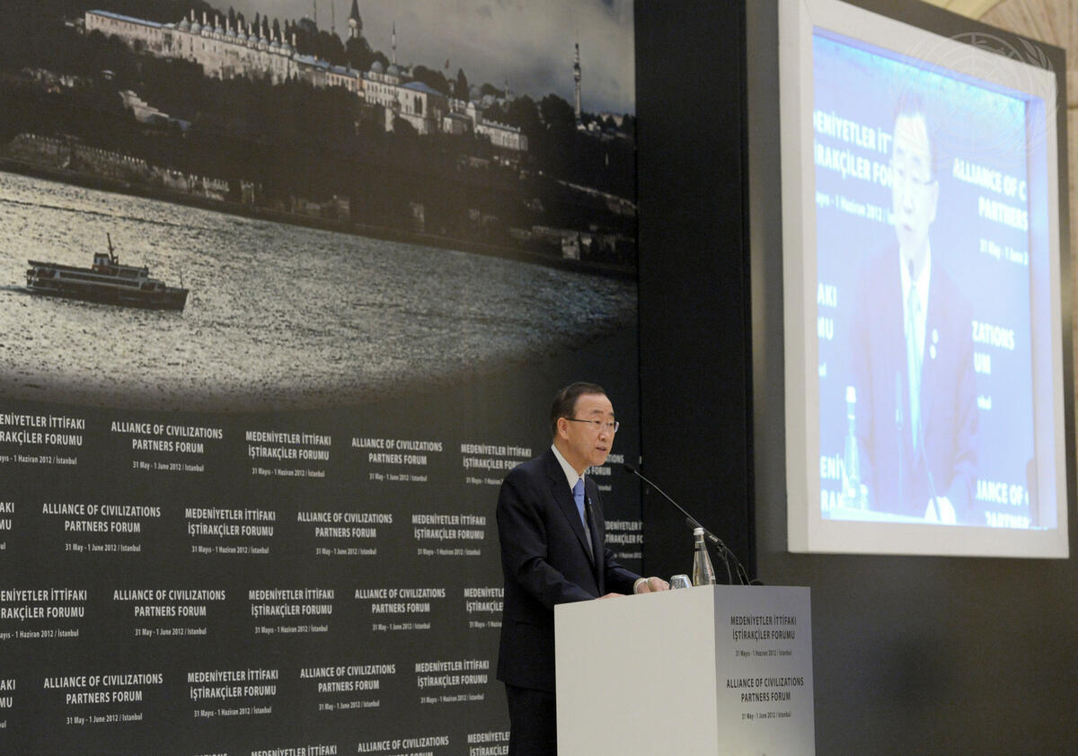 Secretary-General Ban Ki-moon (at podium and on screens) addresses the Partners Forum of the UN Alliance of Civilizations (UNAOC) in Istanbul, Turkey.