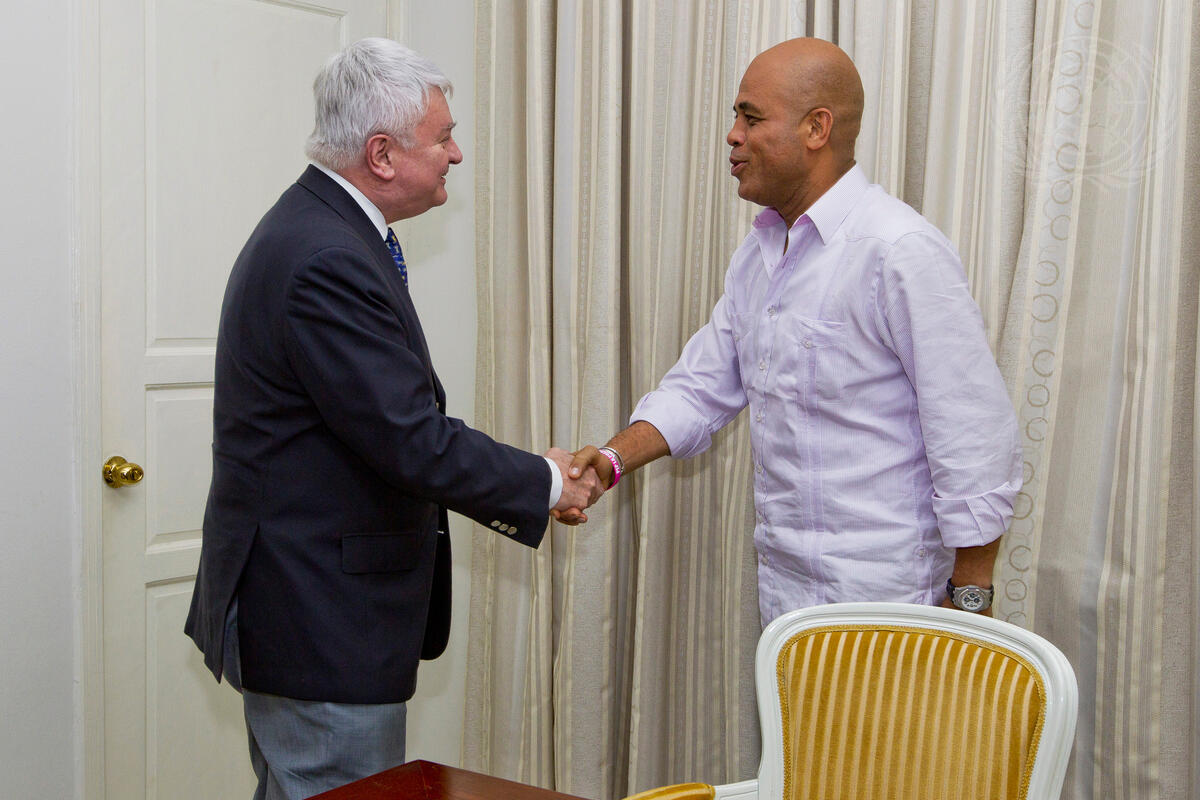 Hervé Ladsous (left), Under-Secretary-General for Peacekeeping Operations, meets with Michel Joseph Martelly, President of Haiti.