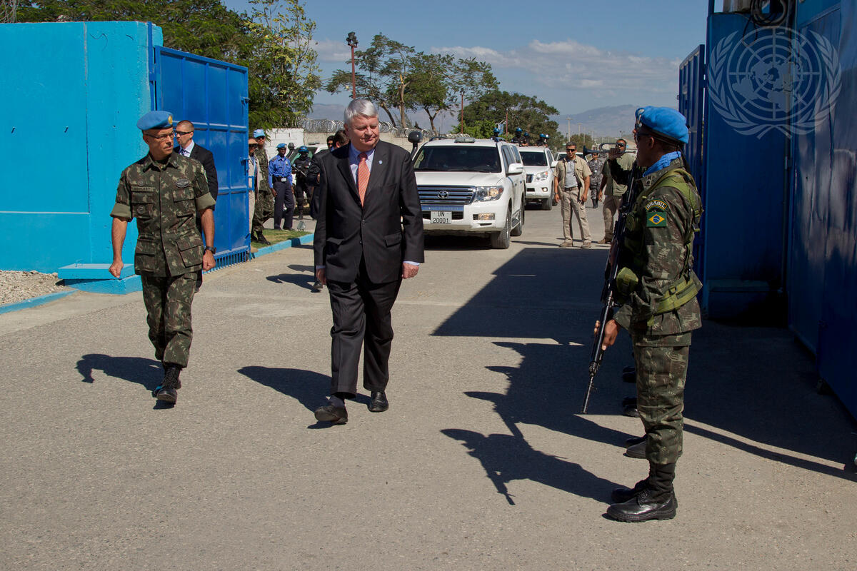 Hervé Ladsous (centre), Under-Secretary-General for Peacekeeping Operations, accompanied by Major General Fernando Rodrigues Goulart (left), Force Commander of the UN Stabilization Mission in Haiti (MINUSTAH), visits ""Camp Charlie"", base to Brazilian peacekeepers of MINUSTAH.