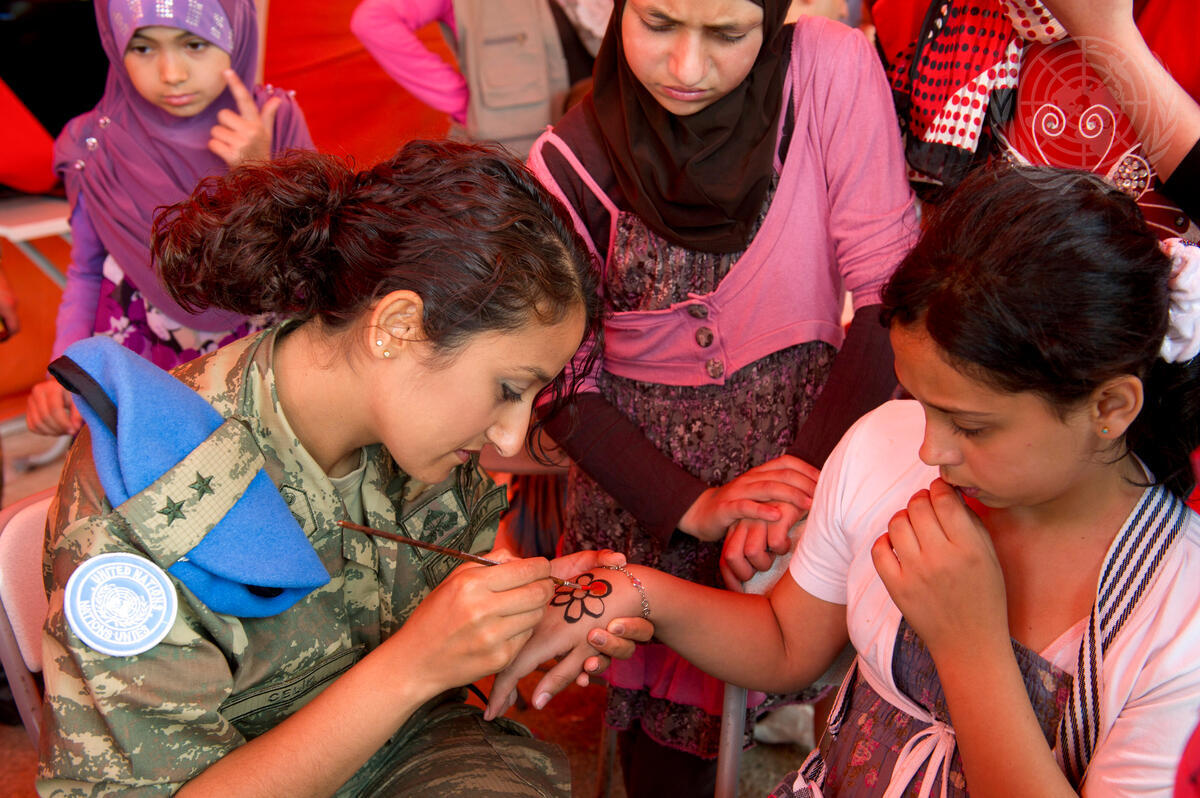 A Turkish peacekeeper serving with the UN Interim Force in Lebanon (UNIFIL) paints a flower on a girl’s hand at a children’s fair organized by UNIFIL in Sultaniya, south Lebanon.
