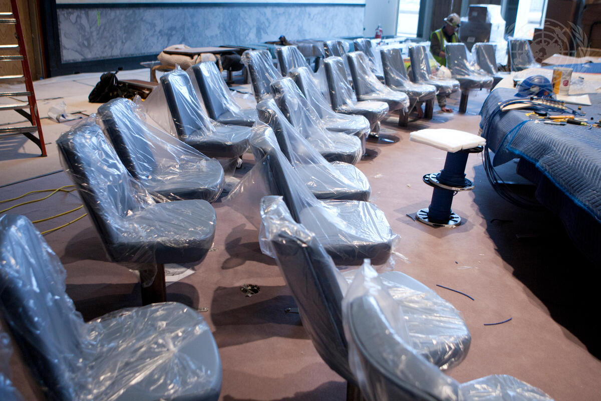 As the renovation of the UN Headquarters in New York continues under the Capital Master Plan, workers install seats in the Security Council Chamber still under construction.