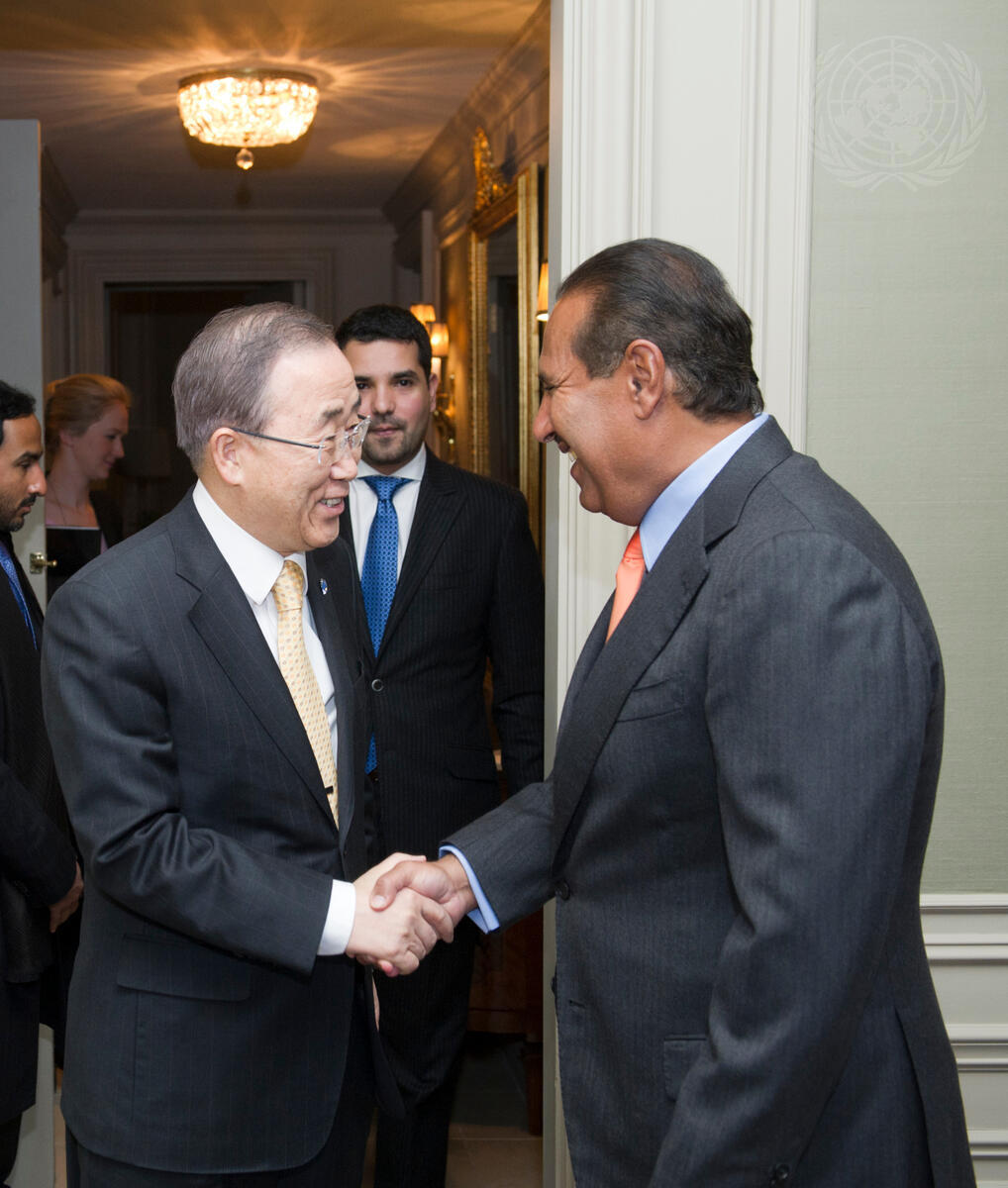 Secretary-General Ban Ki-moon (left) meets with Sheikh Hamad bin Jassim bin Jabr Al-Thani, Prime Minister and Minister for Foreign Affairs of the State of Qatar, at the St. Regis Hotel in New York.