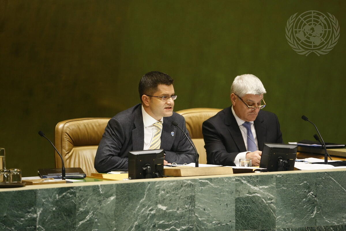 Vuk Jeremic (left), President of the Assembly's sixty-seventh session, chairs the meeting. At right is Ion Botnaru, Director of the General Assembly and Economic and Social Council (ECOSOC) Affairs Division.