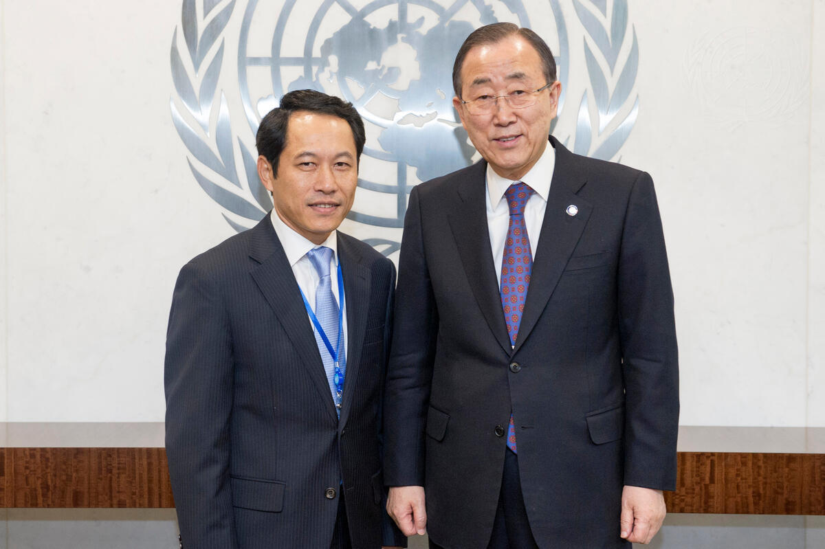 Secretary-General Ban Ki-moon (right) meets with Saleumxay Kommasith, Permanent Representative of the Lao People’s Democratic Republic to the UN and Chair of the Group of the Landlocked Developing Countries (LLDCs).