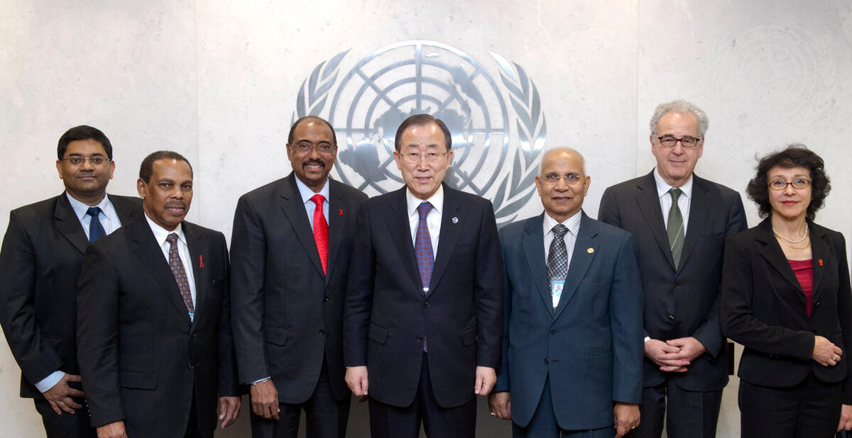 Secretary-General Ban Ki-moon (centre) meets with his Special Envoys for HIV/AIDS: John Edward Greene (second from left), Special Envoy for AIDS in the Caribbean; Michel Sidibé (third from left), Executive Director of the Joint UN Programme on AIDS and HIV (UNAIDS); J.V.R. Prasada Rao (third from right), Special Envoy for AIDS in Asia and the Pacific; Michel Kazatchkine (second from right), Special Envoy for AIDS in Eastern Europe and Central Asia.
