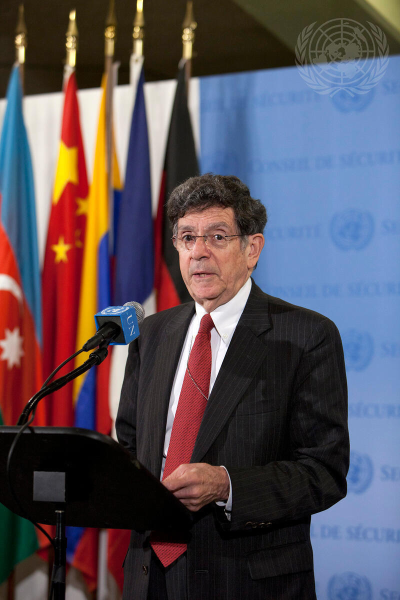 Gert Rosenthal, Permanent Representative of Guatemala to the UN and President of the Security Council for the month of October, delivers a Council press statement on the attack on peacekeepers in Darfur, which took place on 2 October and resulted in the deaths of four Nigerian peacekeepers serving with the African Union-United Nations Hybrid Operation in Darfur (UNAMID).