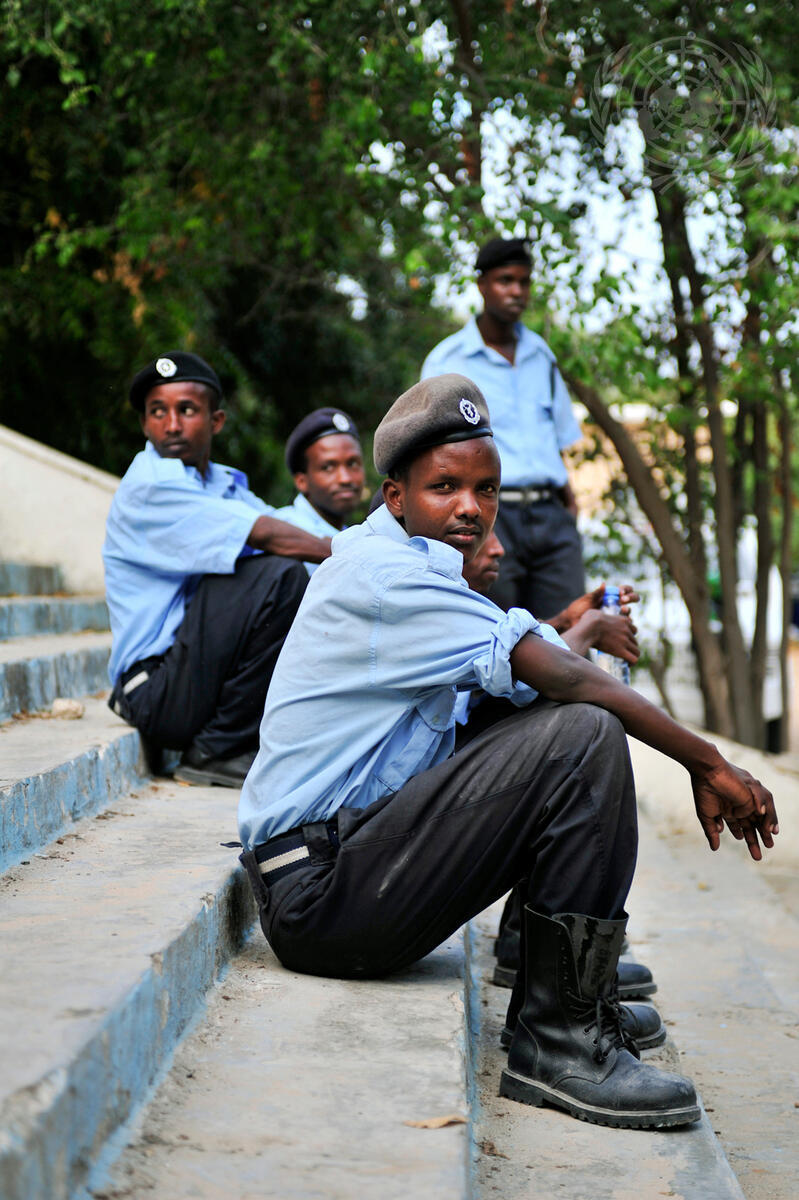 Somali national police officers are pictured outside the General Kaahiye Academy in Mogadishu. Police forces with the African Union Mission in Somalia (AMISOM) will conduct training sessions at the academy, including on criminal investigation.