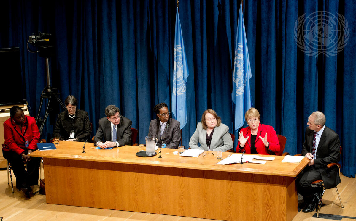 Michelle Bachelet (second from right), Executive Director of UN Women, speaks at a joint press conference on the work of the Special Court for Sierra Leone, especially on behalf of women, following the Court’s briefing to the Security Council this morning. The Special Court is the first in history whose principals – the president, registrar, prosecutor, and defender – are all women.
