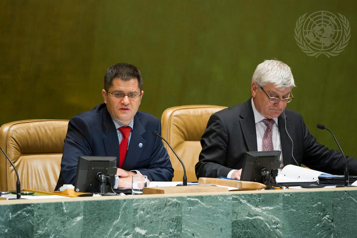 Vuk Jeremic (left), President of the sixty-seventh session of the General Assembly, chairs the Assembly’s debate on progress in the implementation of the New Partnership for Africa’s Development (NEPAD). At right is Ion Botnaru, Director of the General Assembly and the Economic and Social Council (ECOSOC) Affairs Division.