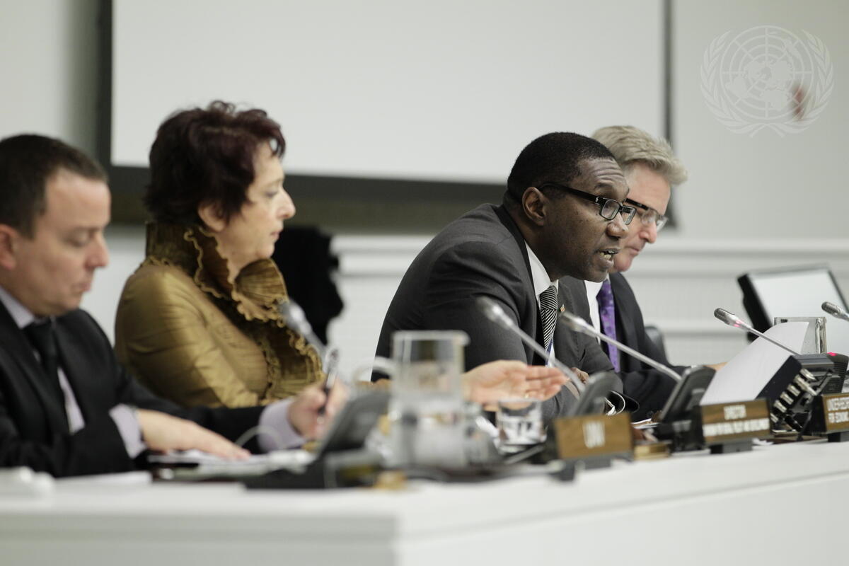 Henry L. Mac-Donald (second from right), Permanent Representative of Suriname to the United Nations and Chair of the General Assembly’s Third Committee (Social, Humanitarian and Cultural) for the Assembly’s sixty-seventh session, addresses the Committee’s first meeting of the session. The agenda for the meeting includes election of the Committee’s Vice-Chairs and Rapporteur for the session.