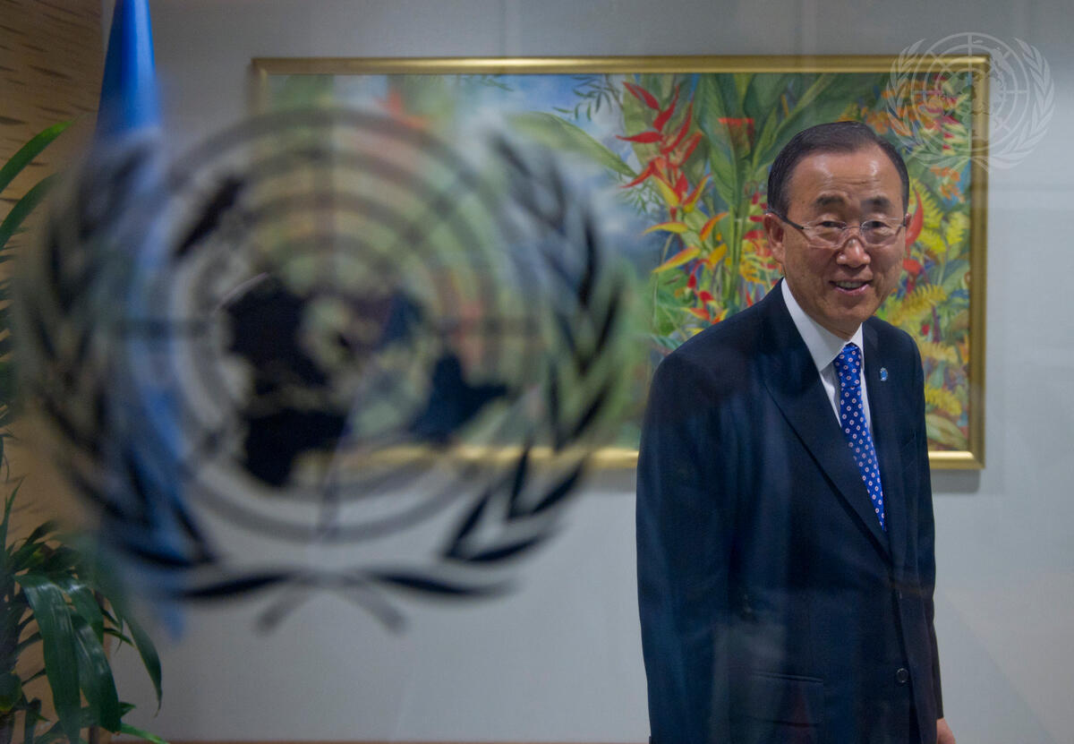 Secretary-General Ban Ki-moon is seen through a glass door stamped with the UN emblem, shortly before his meeting with the Prime Minister of Kuwait.
