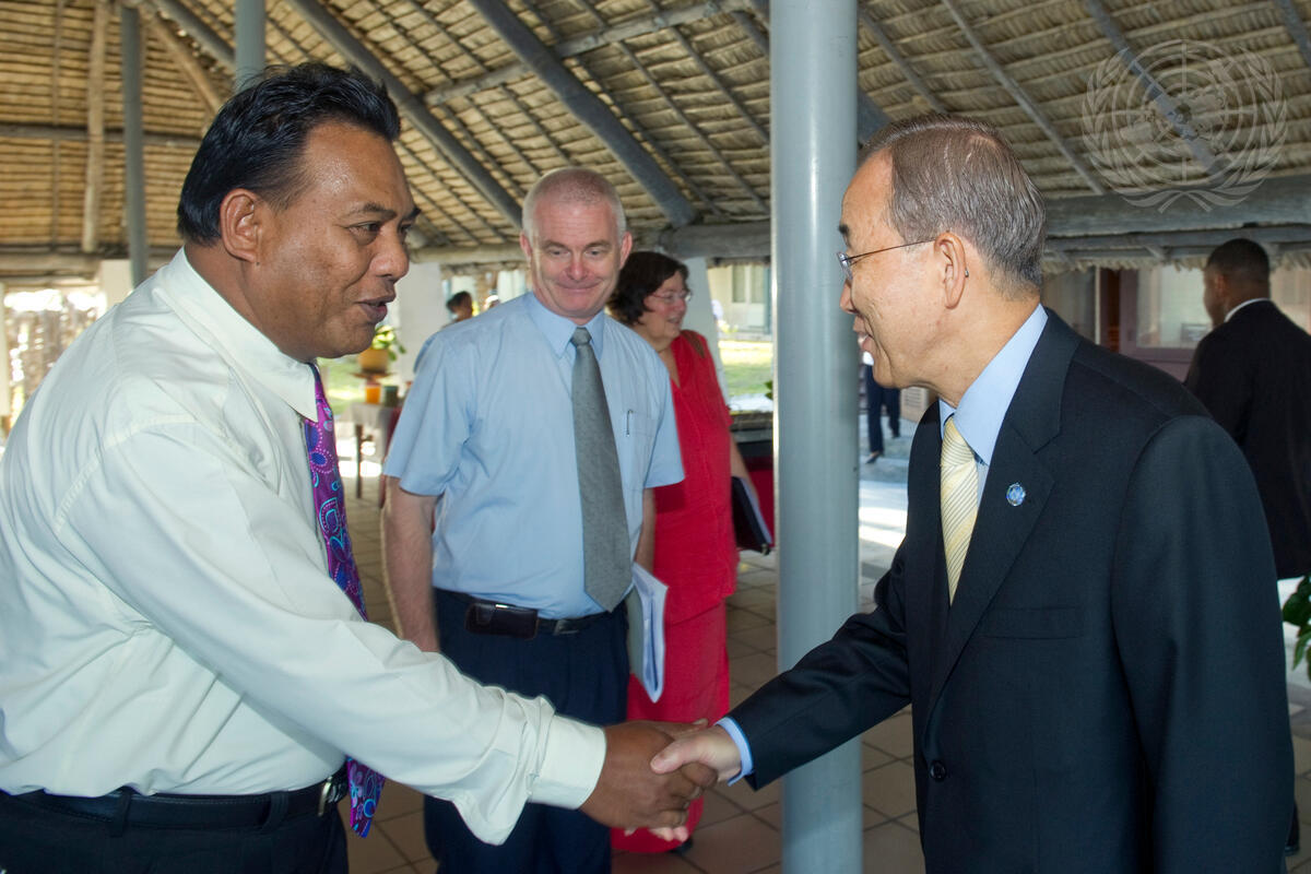 Secretary-General Ban Ki-moon (right) meets with Amberoti Nikora, Minister of Environment, Lands and Agricultural Development of the Republic of Kiribati, in Tarawa, Kiribati’s main atoll.