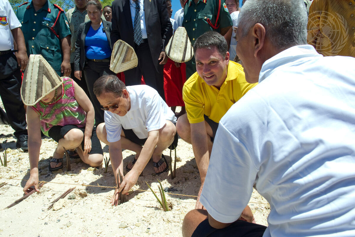 Secretary-General Ban Ki-moon (second from left) and, from left, his wife, Yoo Soon-taek; Richard Marles, Australia’s Permanent Secretary for Pacific Island Affairs; and Anote Tong (back to camera), President of the Republic of Kiribati; plant mangrove shoots on Tarawa, Kiribati’s main atoll. Mangroves help to protect against the rising sea levels caused by climate change.