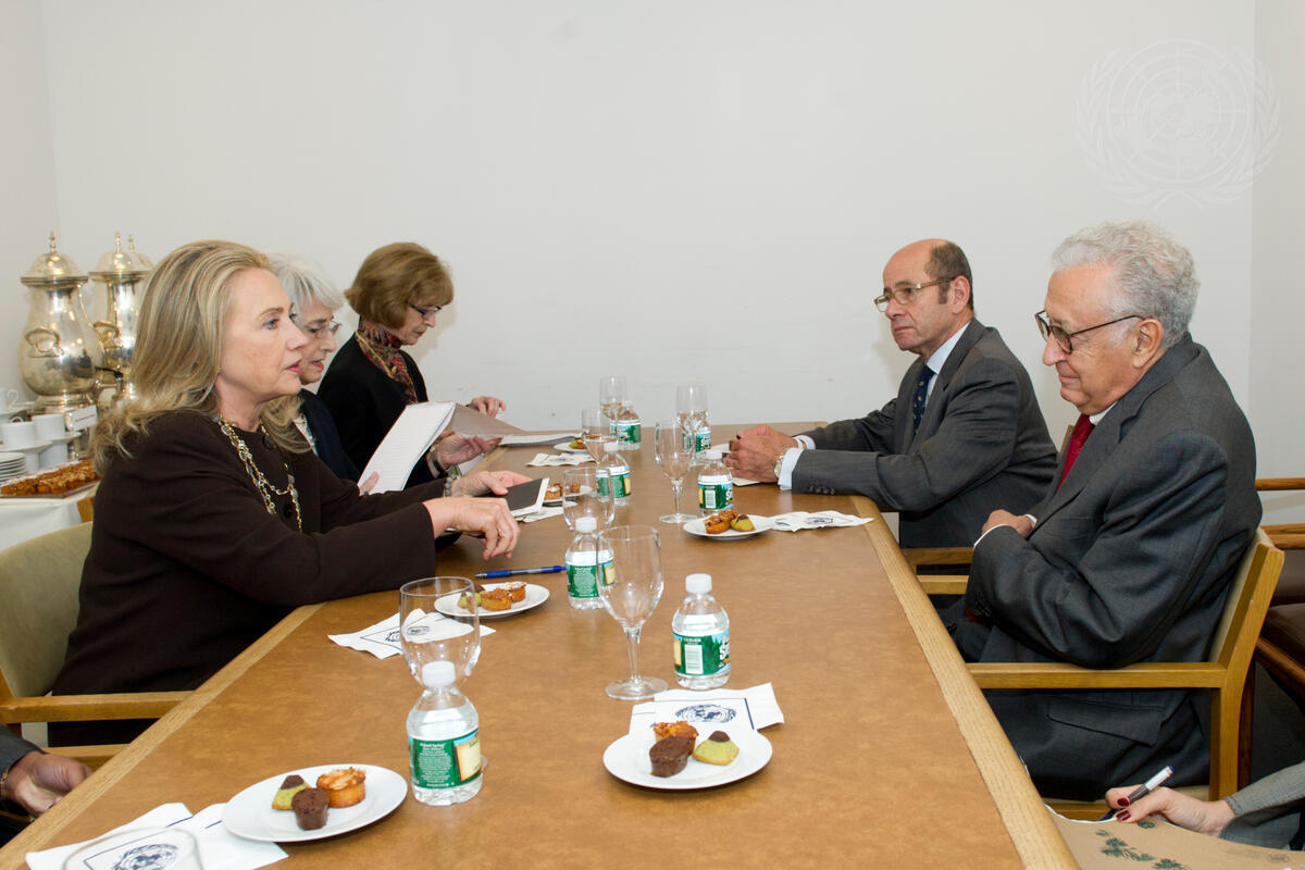 Lakhdar Brahimi (right), Joint Special Representative of the UN and the League of Arab States for Syria, meets with Hillary Rodham Clinton, Secretary of State of the United States. Also in the meeting, Ahmad Fawzi (second from right), Spokesperson for the Joint Representative.
