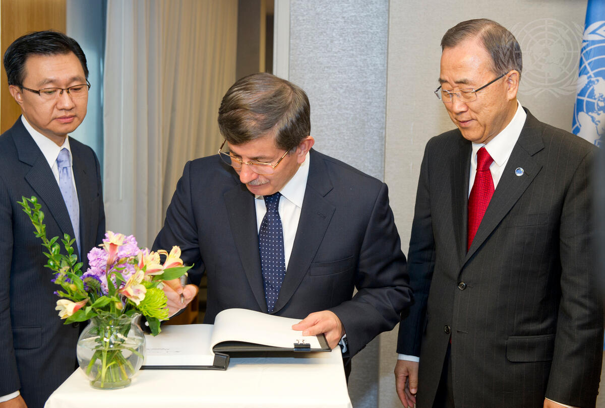Secretary-General Ban Ki-moon (right) met with Ahmet Davutoglu (centre), Minister for Foreign Affairs of Turkey. At left is Yoon Yeocheol, UN Chief of Protocol.