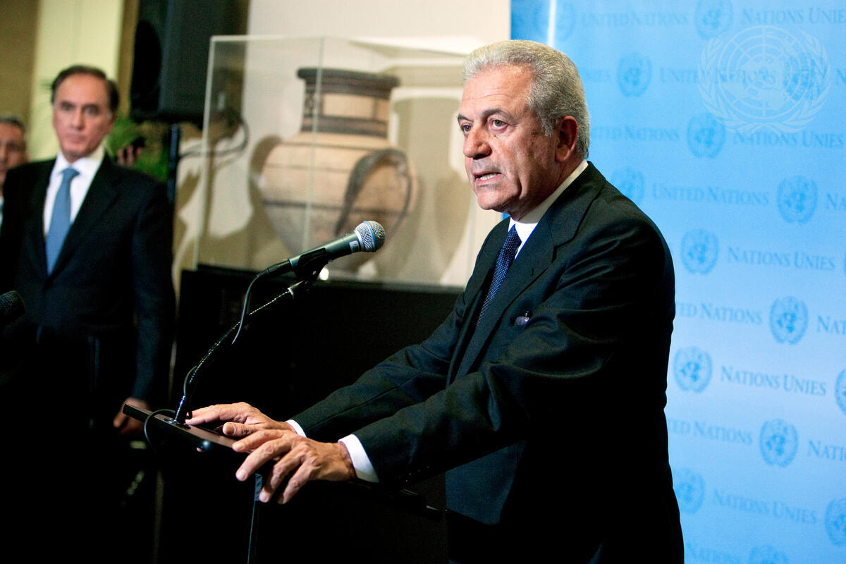 Dimitris Avramopoulos, Foreign Minister of Greece, speaks to journalists at a press conference in the North Lawn conference building at UN Headquarters in New York.