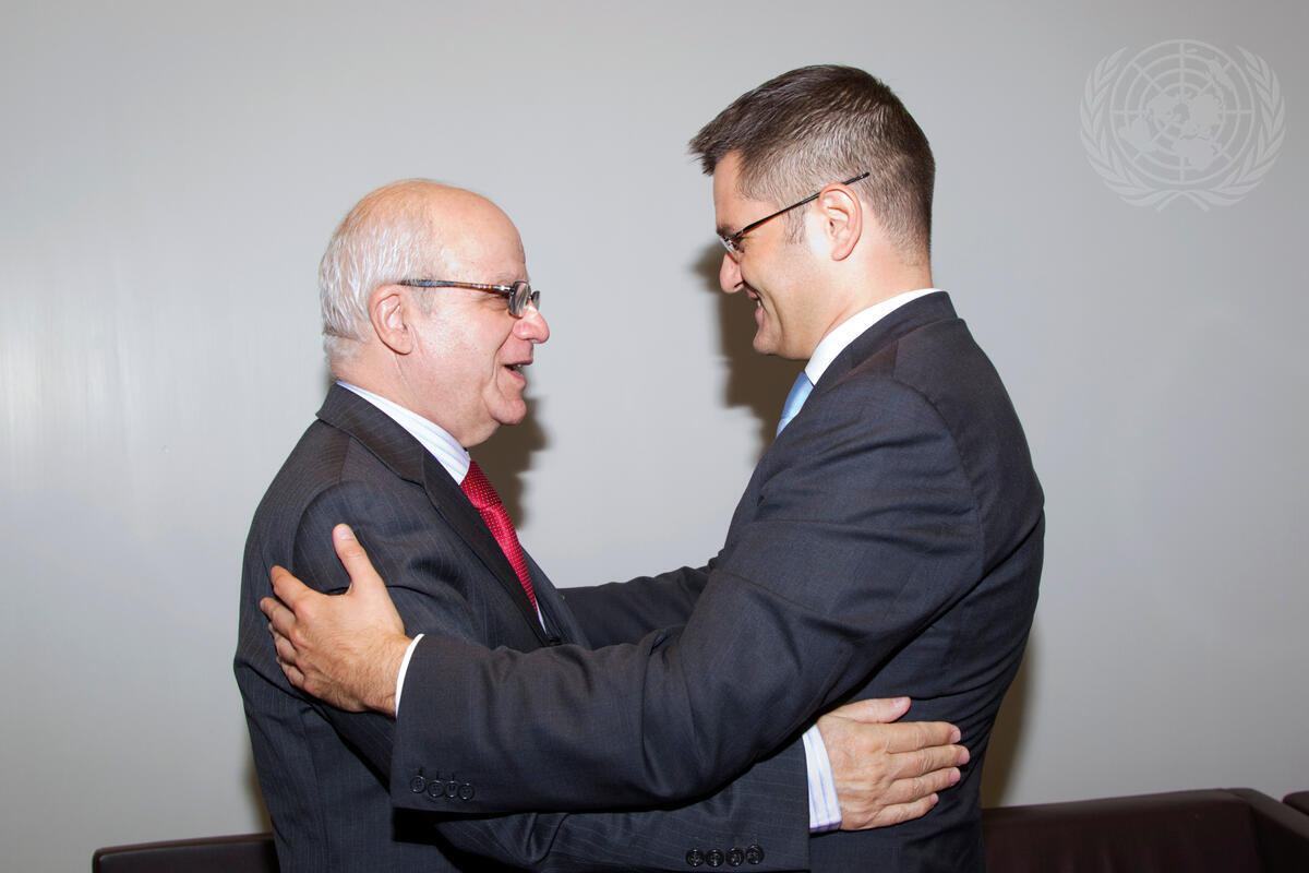 Vuk Jeremic (right), President of the sixty-seventh session of the General Assembly, meets with Mourad Medelci, Minister for Foreign Affairs of Algeria.